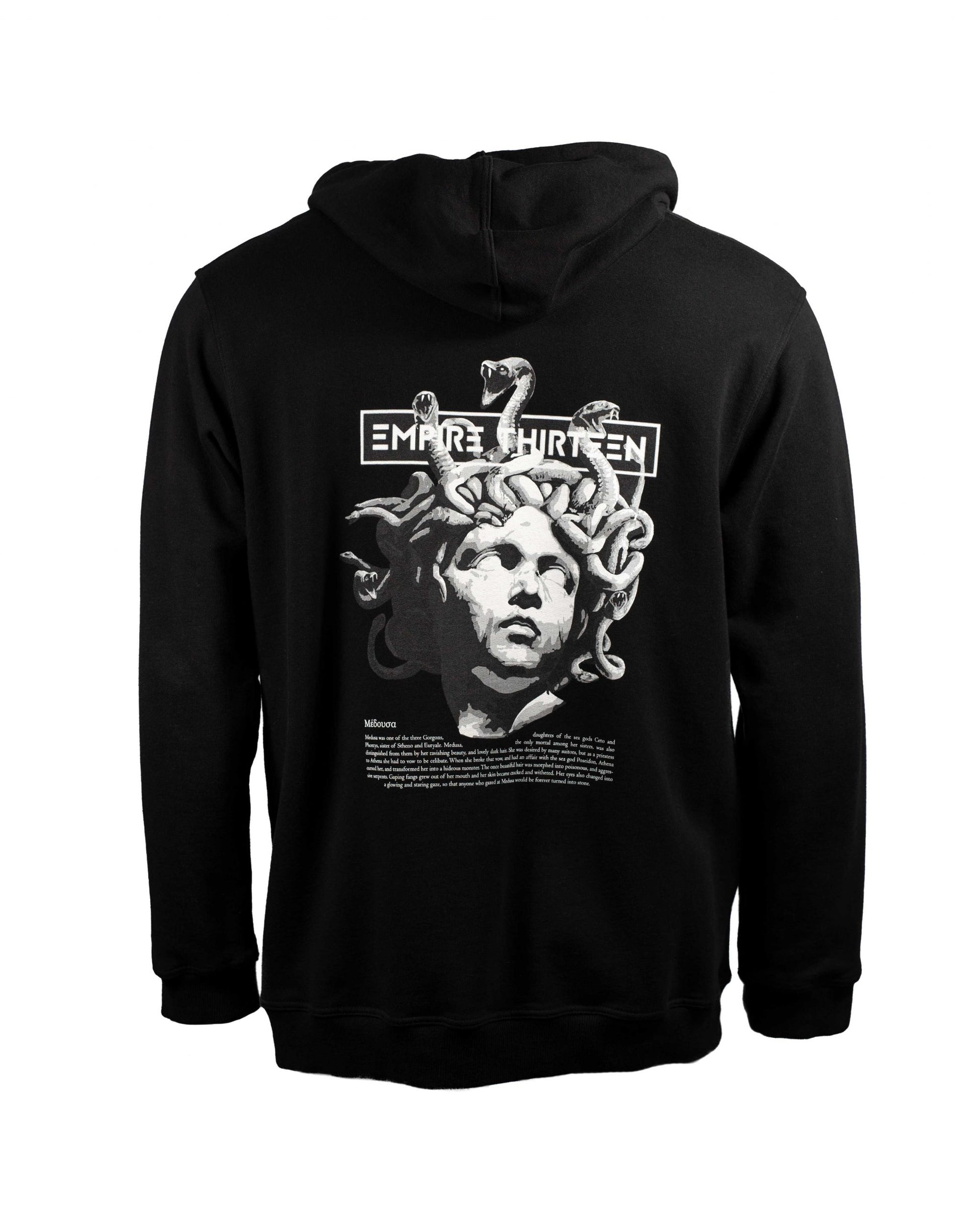 Die Grafik zeigt Medusas Kopf mit ihrer Geschichte und dem „EMPIRE-THIRTEEN“ Logo umgeben von Schlangen, was dem Shirt eine mystische und auffällige Note verleiht.