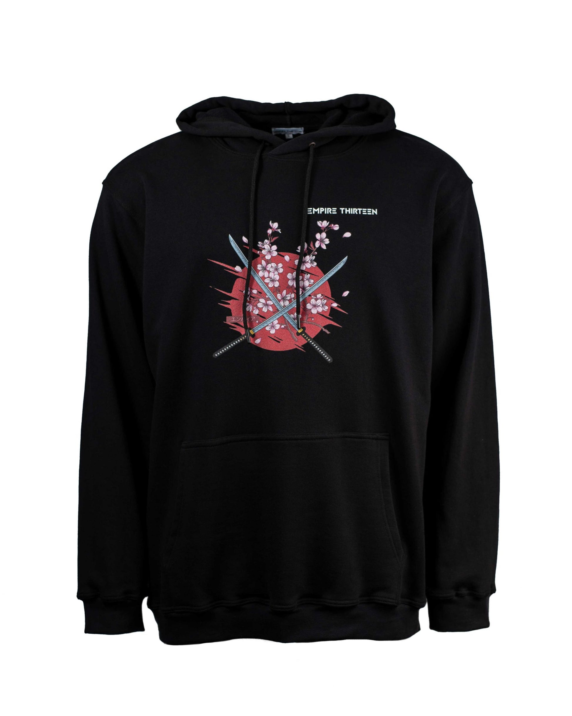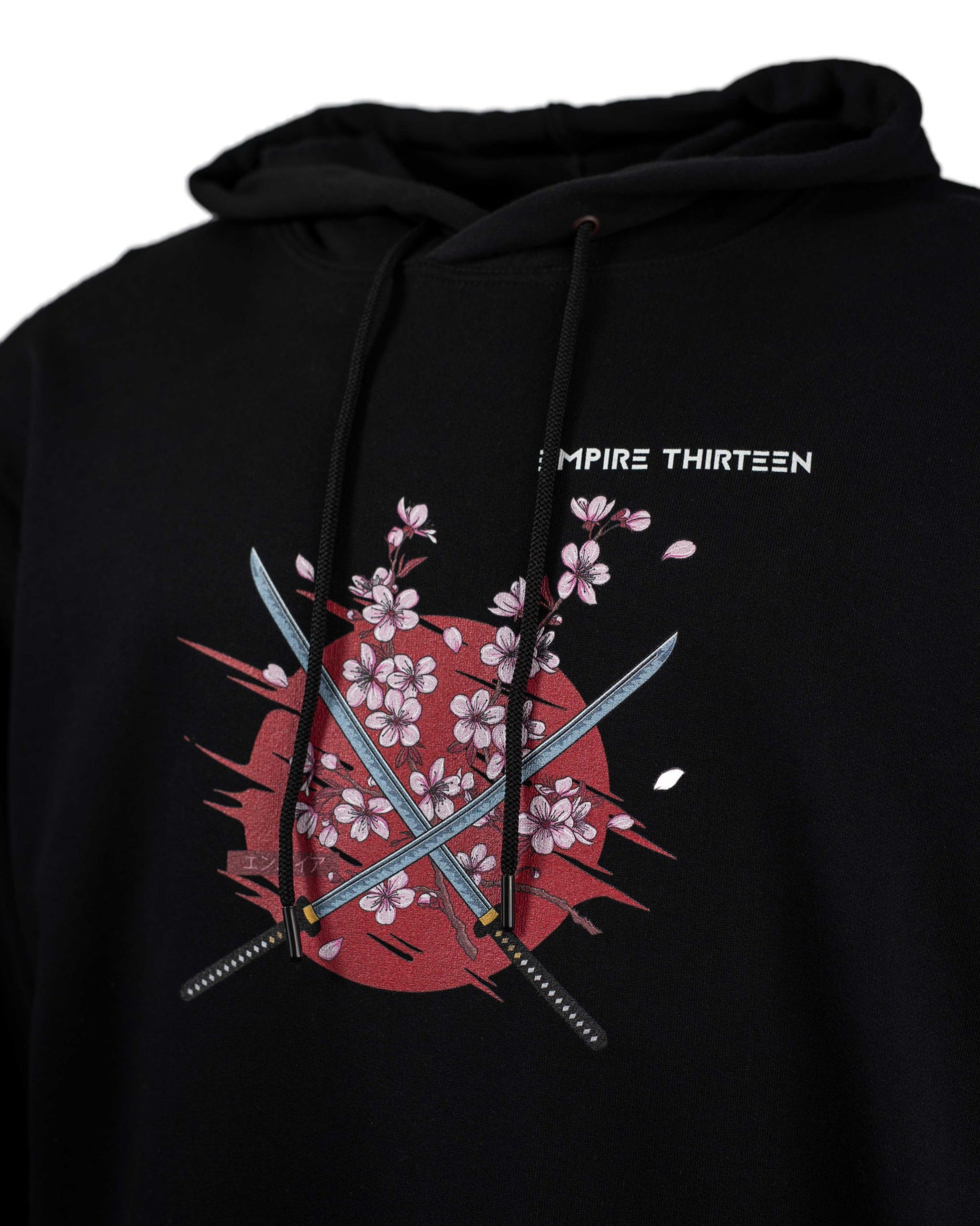 Der Print zeigt zwei gekreuzte Katana-Schwerter vor einer roten Sonne, verziert mit Kirschblüten, die für ihre Schönheit bekannt sind.