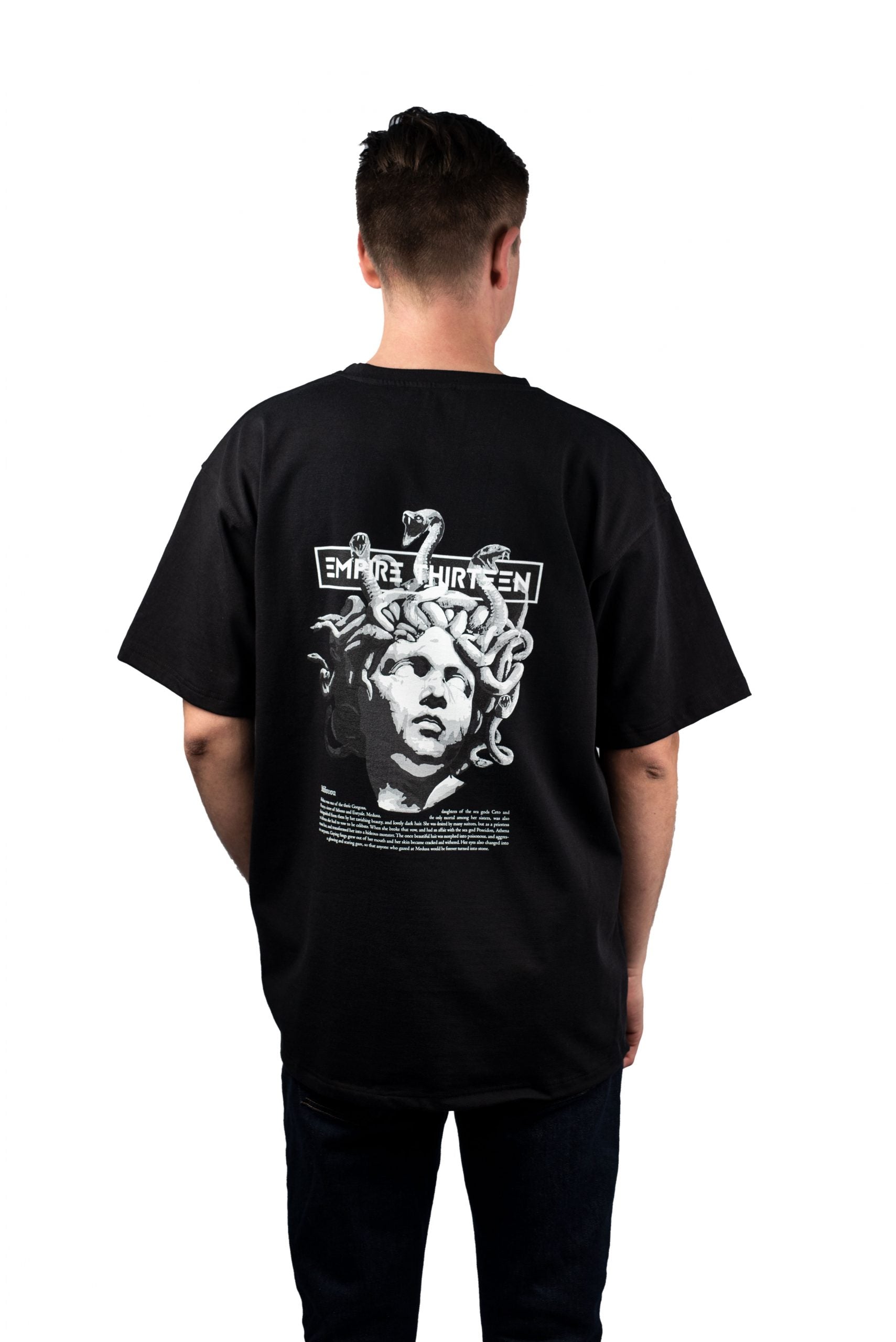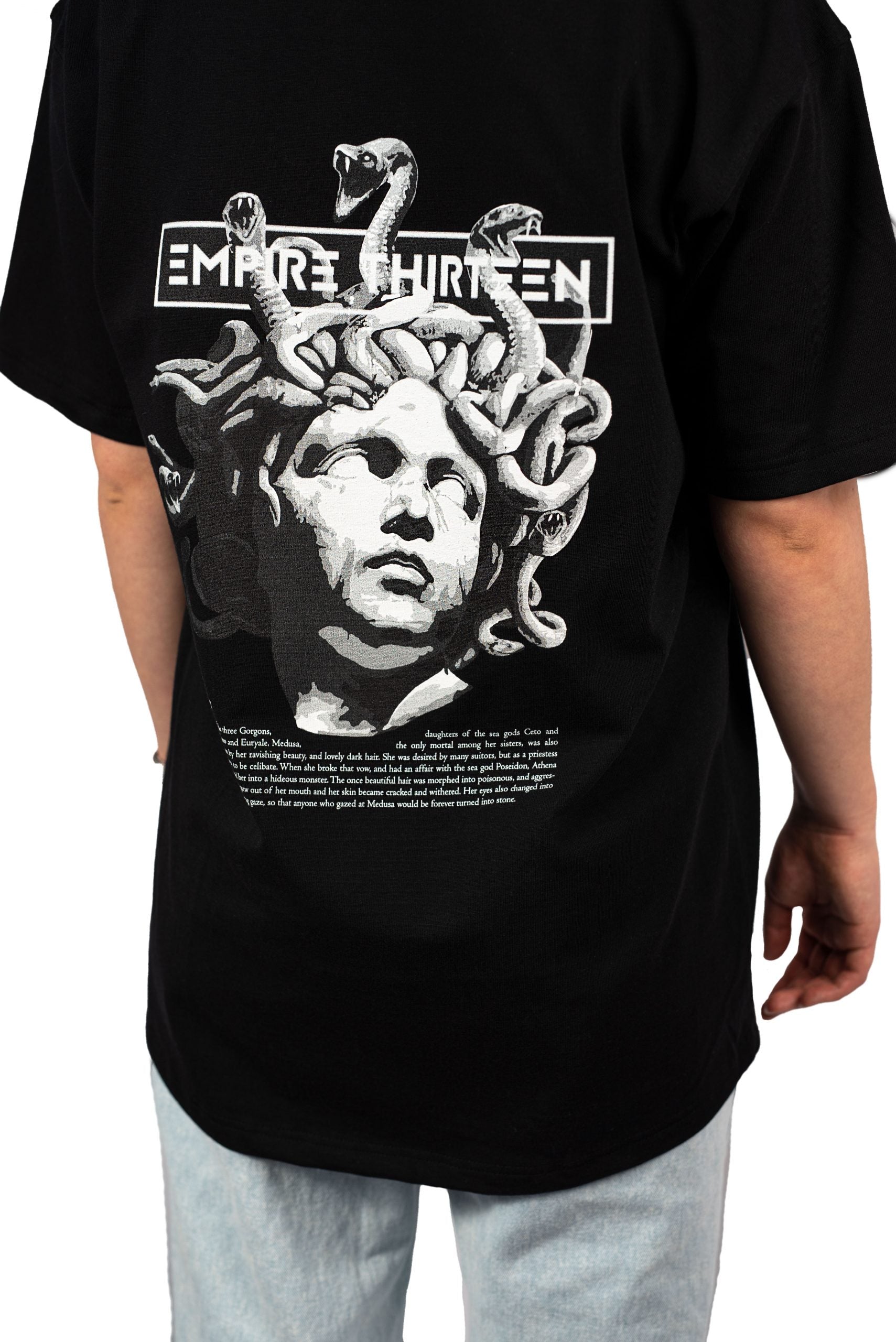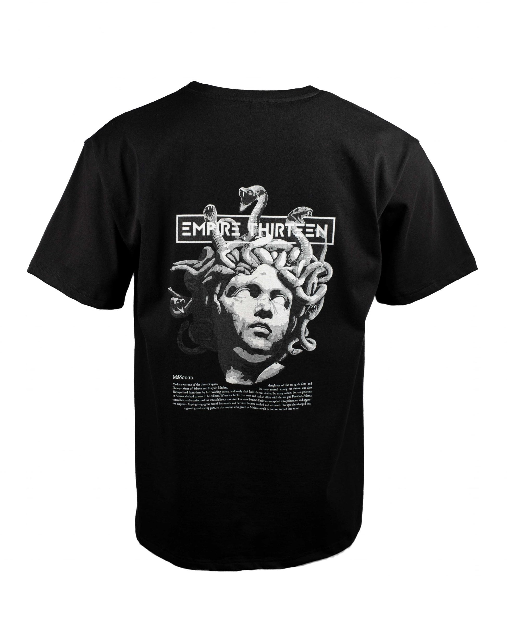 Die Grafik zeigt Medusas Kopf mit ihrer Geschichte und dem „EMPIRE-THIRTEEN“ Logo umgeben von Schlangen, was dem Shirt eine mystische und auffällige Note verleiht.