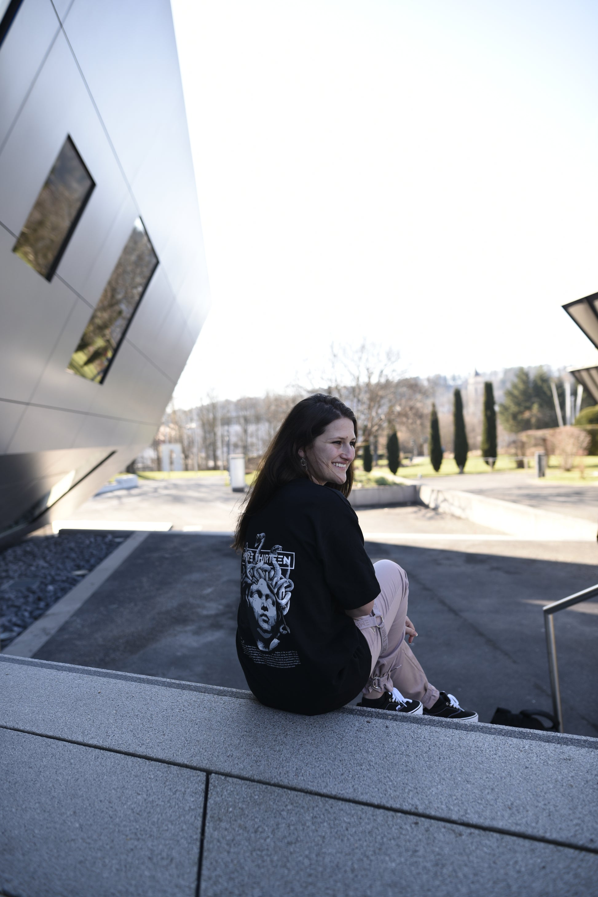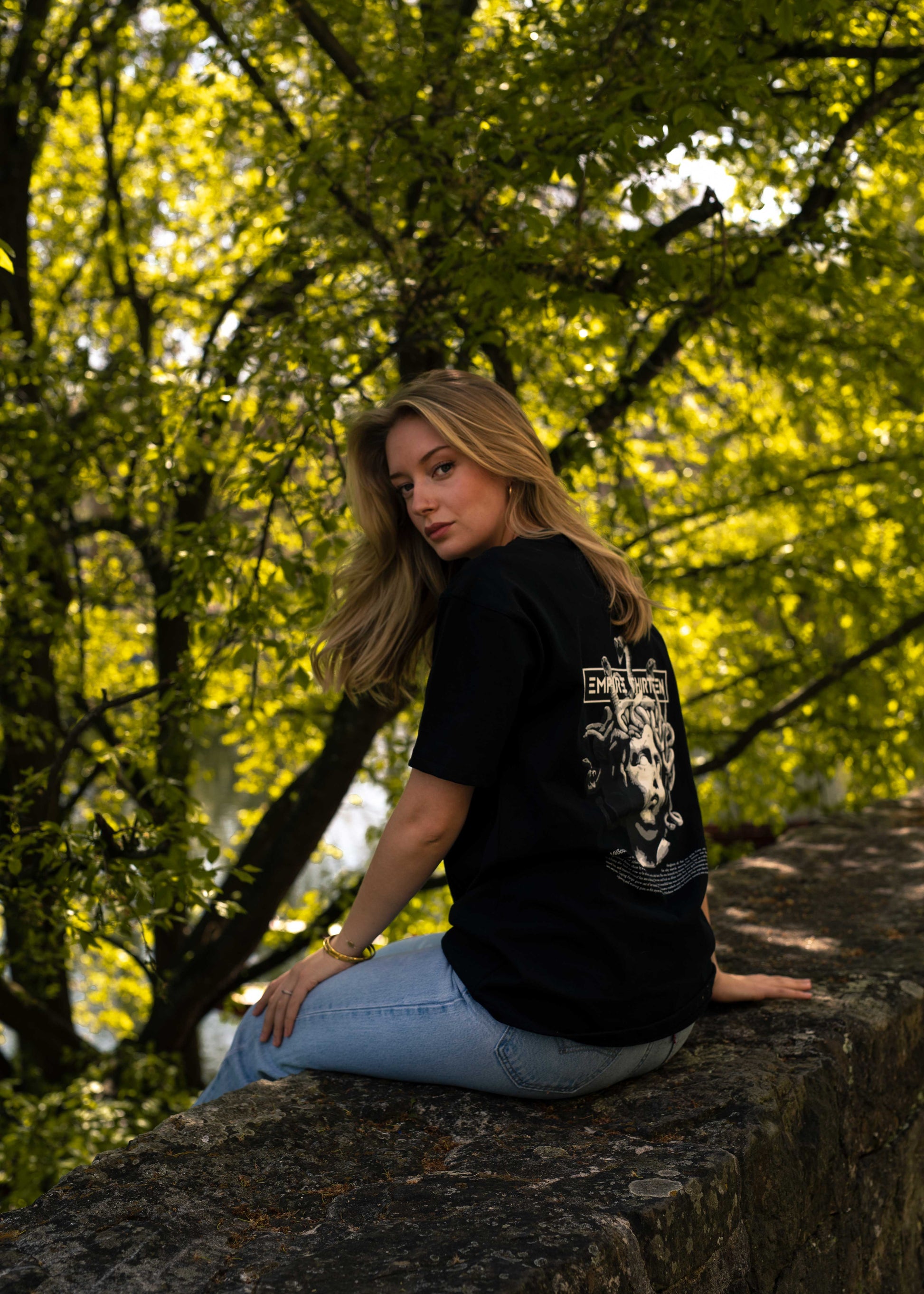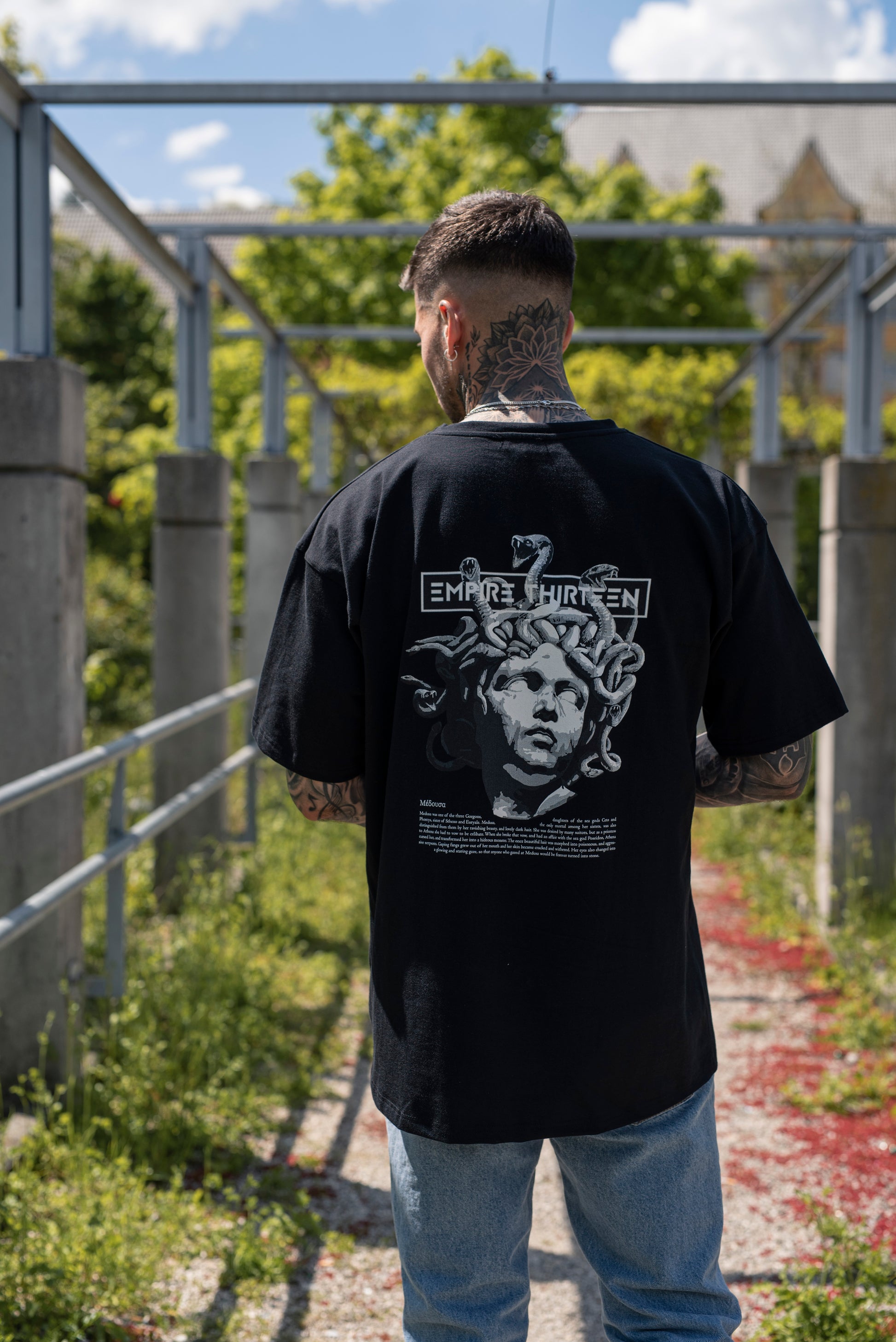 Die Grafik zeigt Medusas Kopf mit ihrer Geschichte und dem „EMPIRE-THIRTEEN“ Logo umgeben von Schlangen, was dem Shirt eine mystische und auffällige Note verleiht.