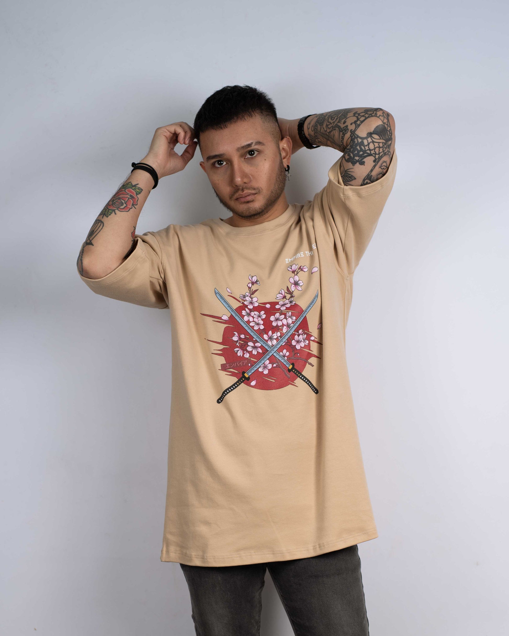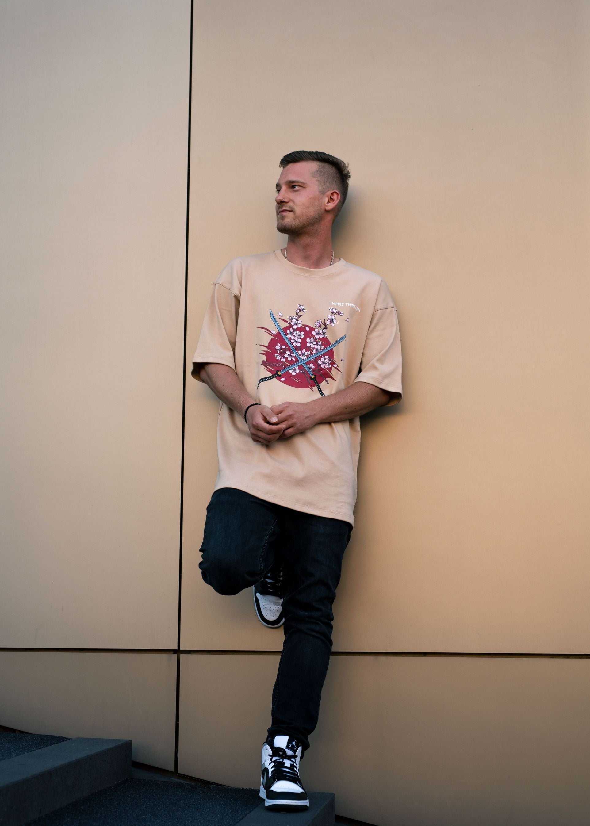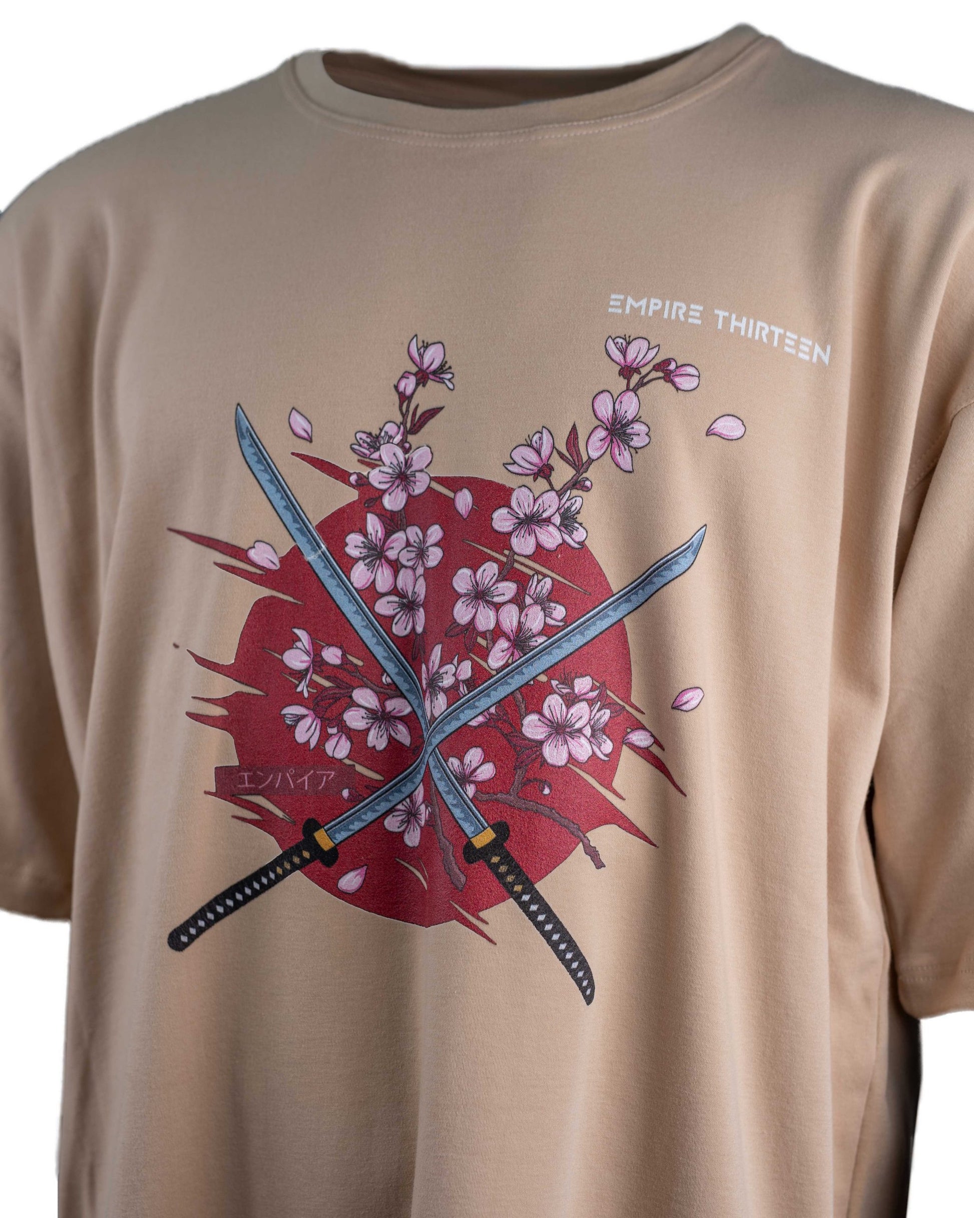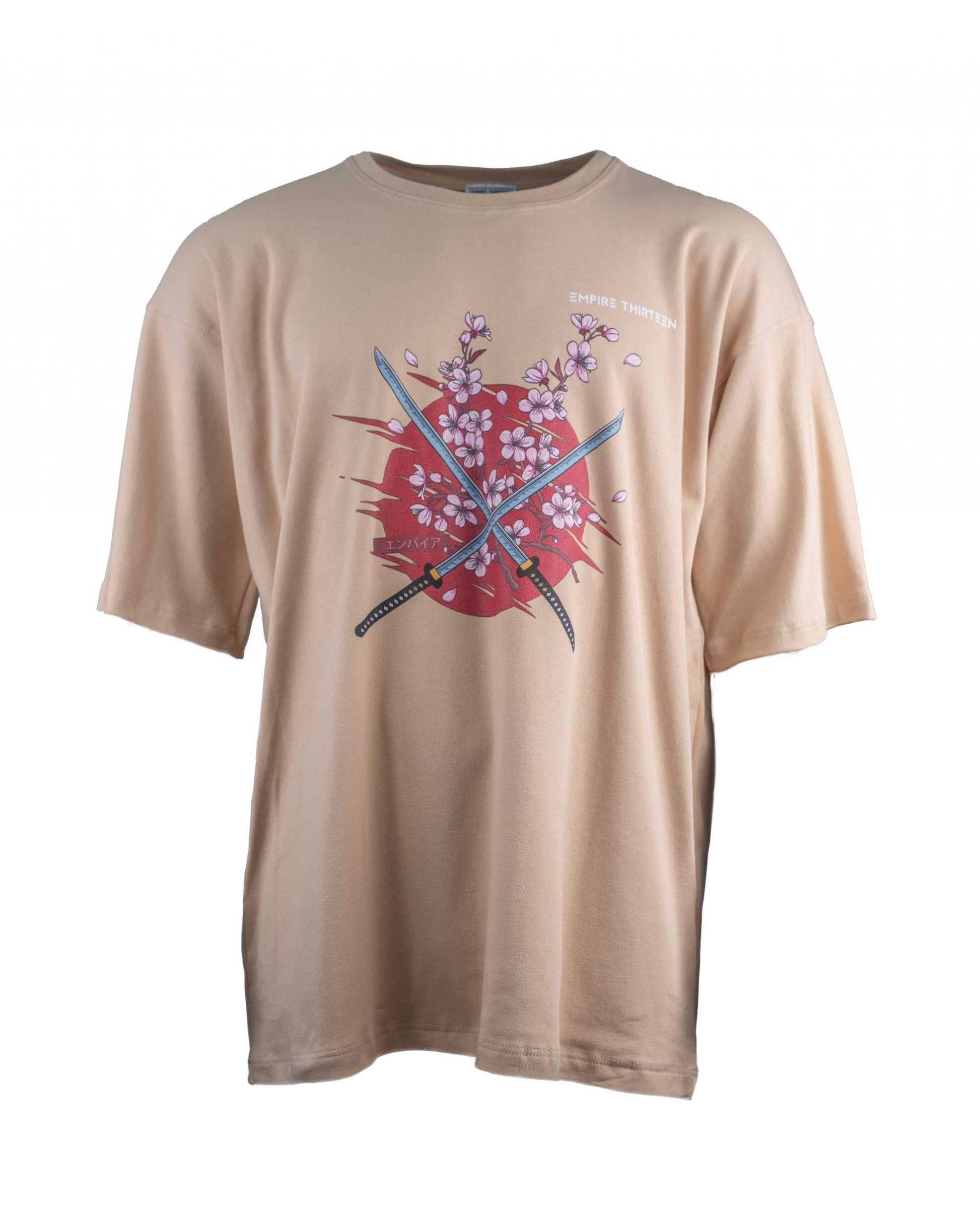 Dieses hochwertige, beige oversized T-Shirt zeichnet sich durch einen eindrucksvollen SAKURA Print auf der Vorderseite aus.