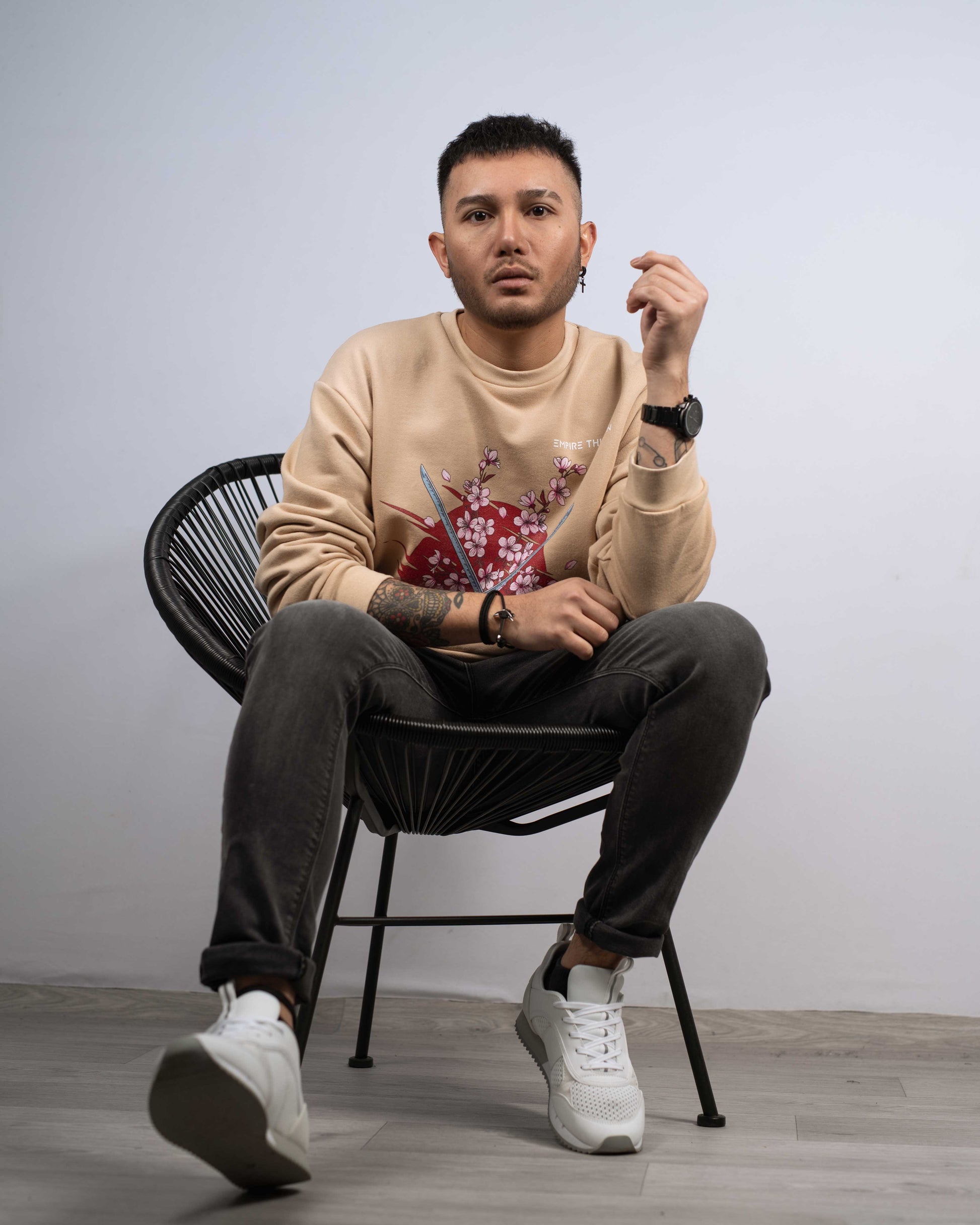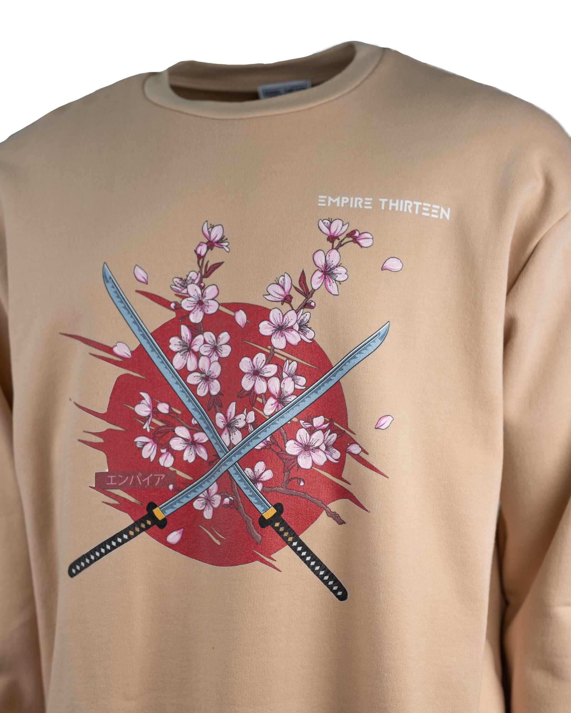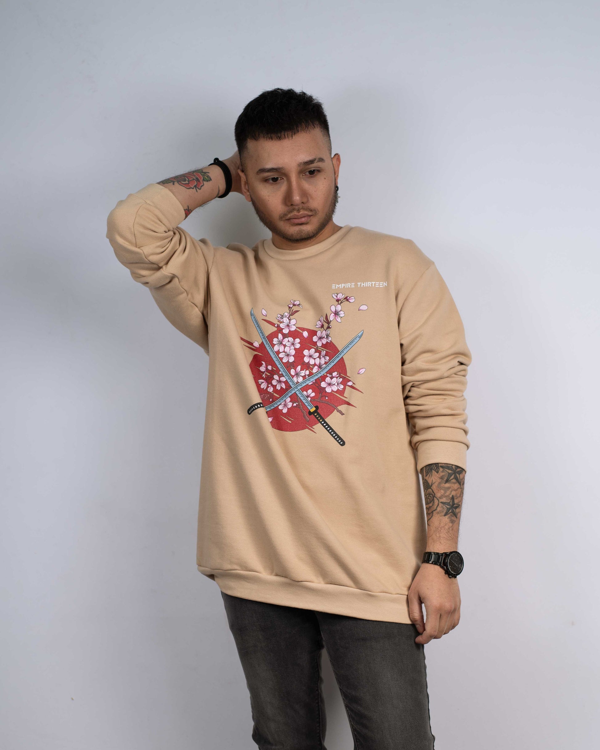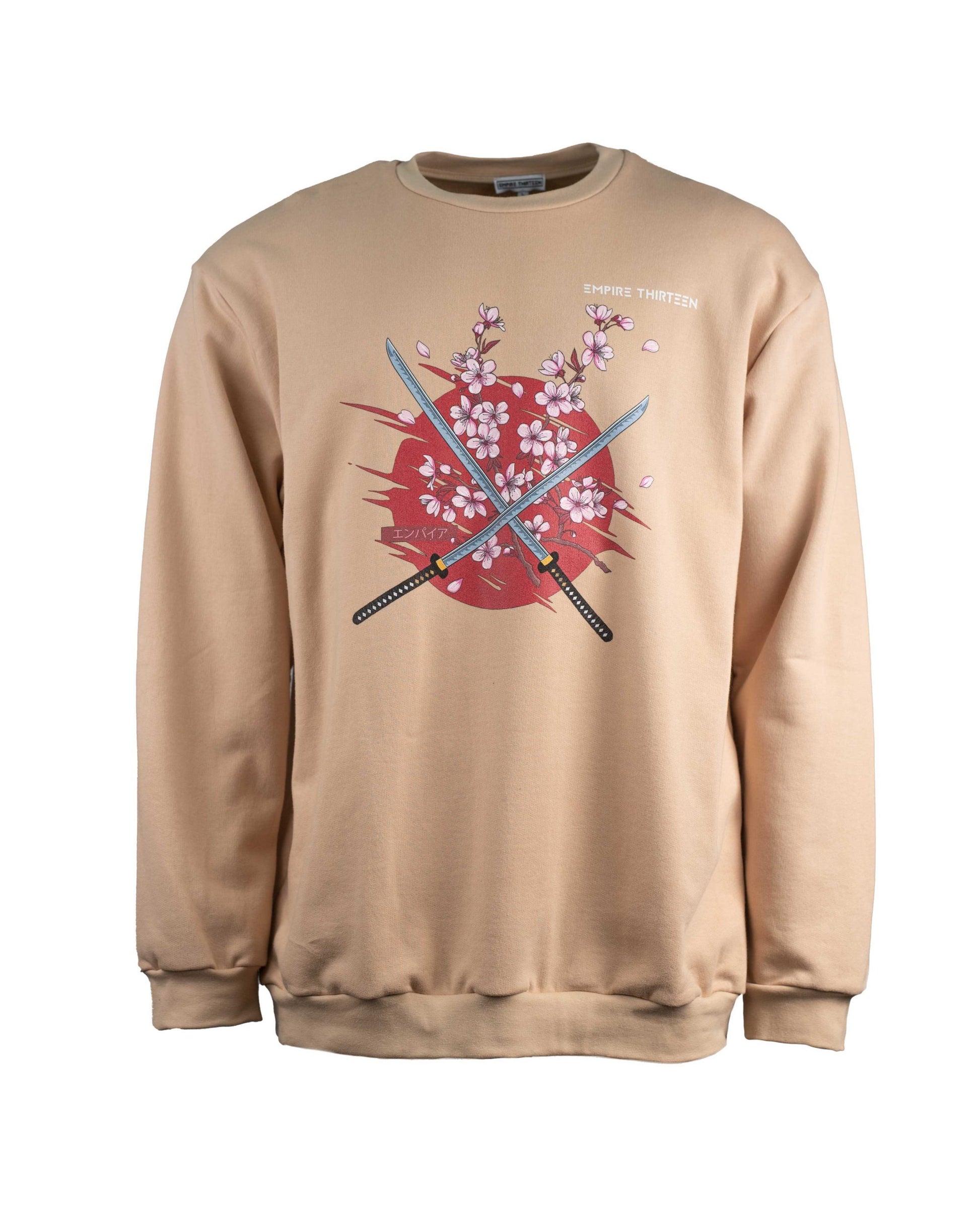 Dieser stilvolle, beige Sweater besticht durch ein einzigartiges Design, das Elemente aus der japanischen Kultur kombiniert.