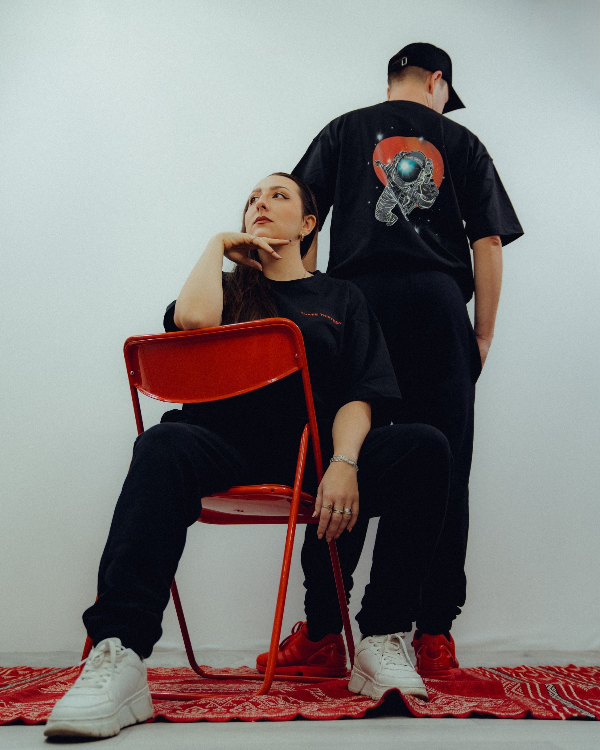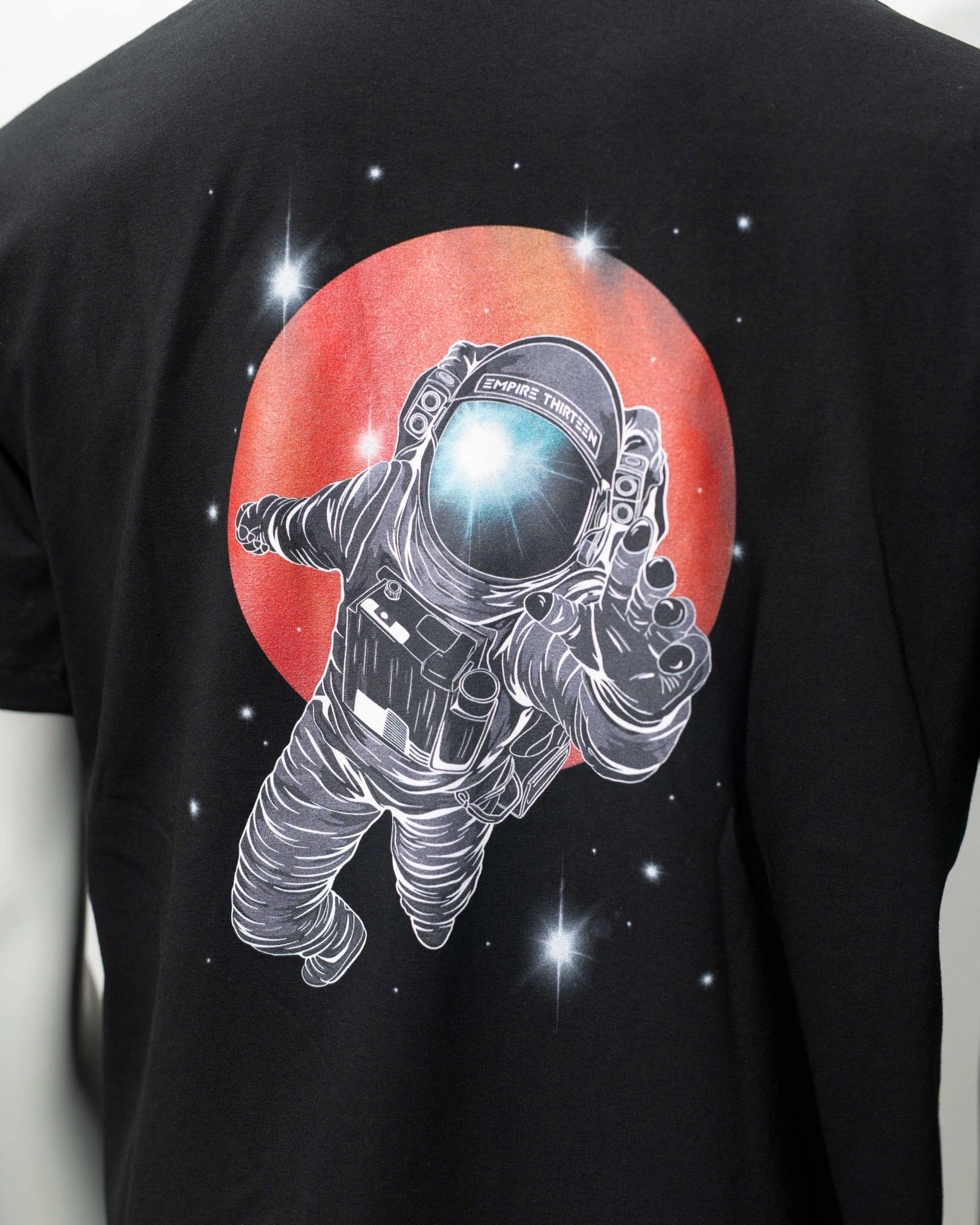Auf der Rückseite zeigt es einen detaillierten Print eines Astronauten im Weltraum vor einem leuchtend roten Hintergrund, der für einen faszinierenden Kontrast sorgt und das Bild zum Leben erweckt.