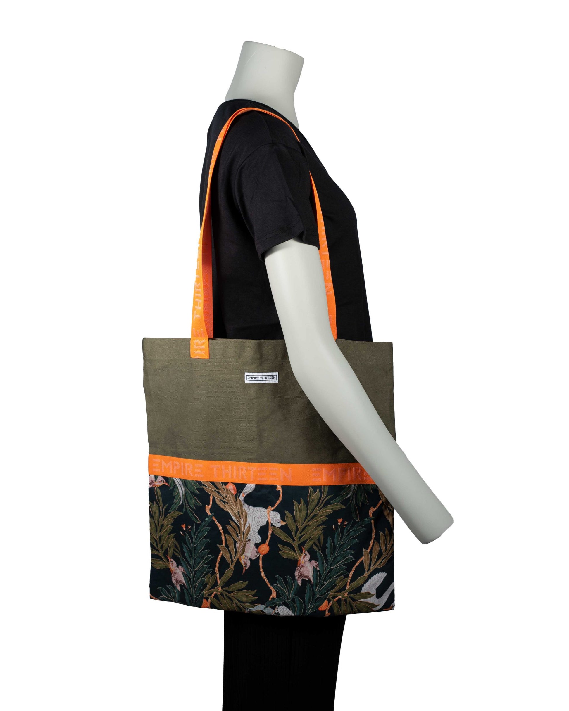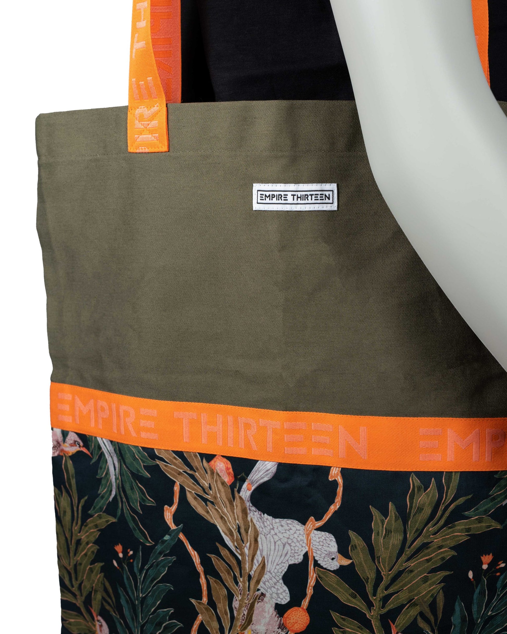 Sie besteht aus einem strapazierfähigen Material in Olivgrün und ist mit einem auffälligen, floralen Print im unteren Teil verziert, der der Tasche einen modischen Look verleiht.